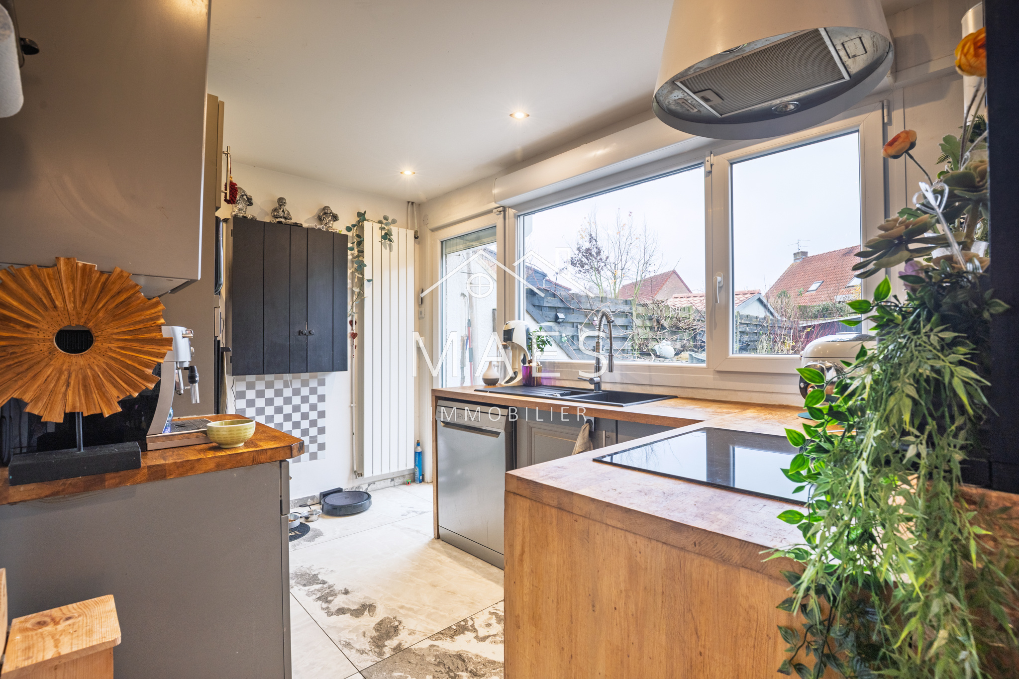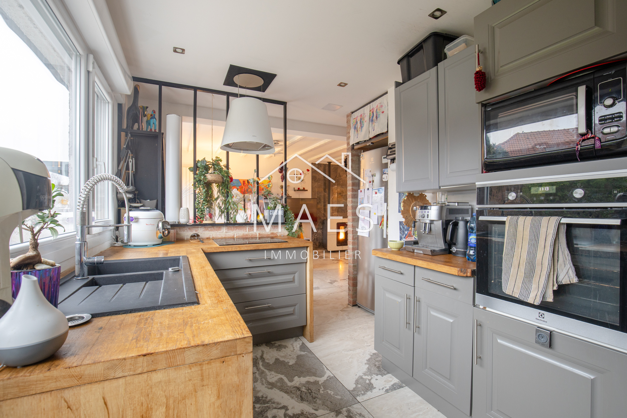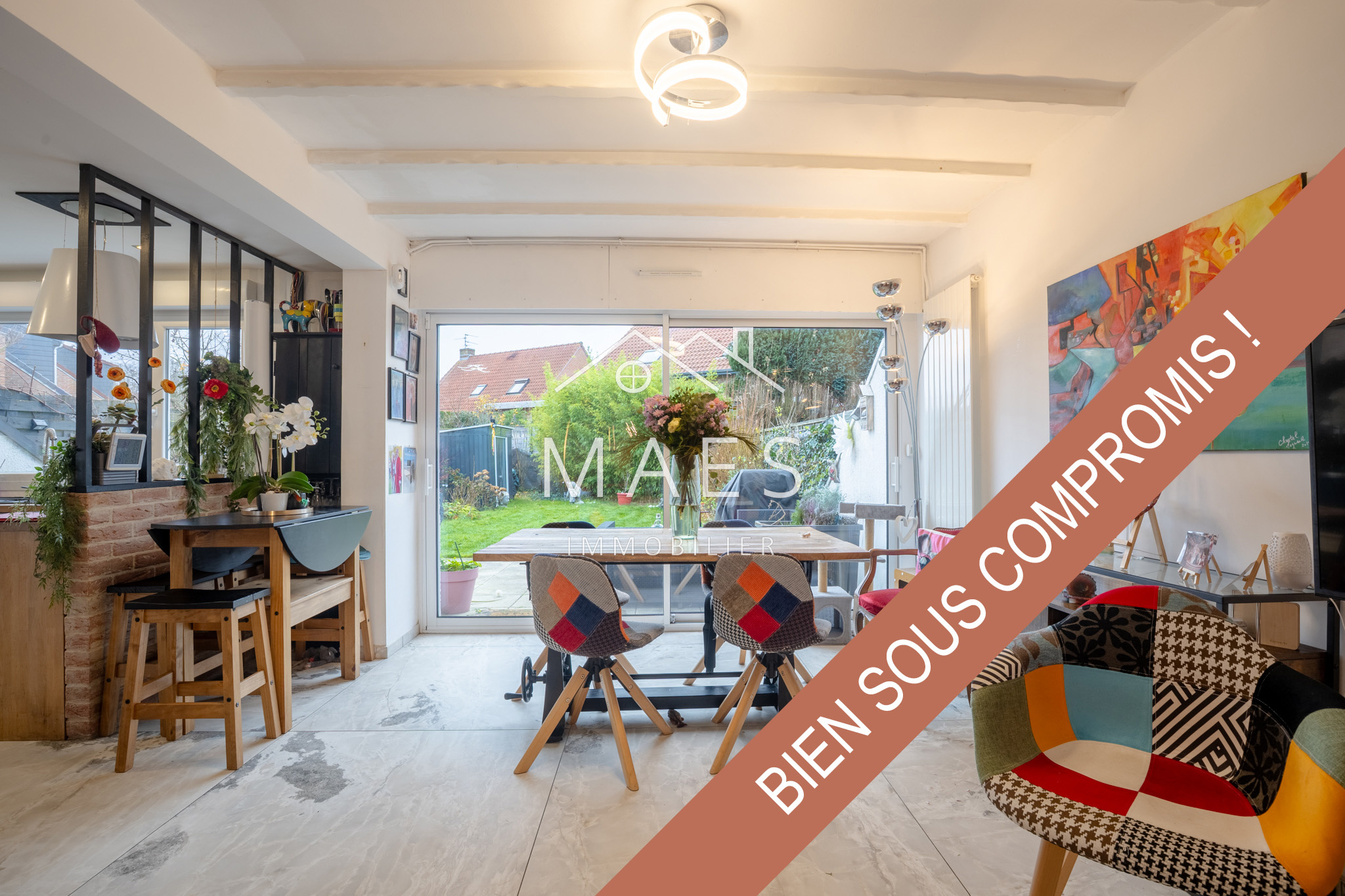 ** SOUS COMPROMIS ** EXCLUSIVITE - Nouveauté ! Idéalement située en centre-ville de WAMBRECHIES, à proximité des commerces, transports et écoles, ainsi que de la Deûle et des chemins de campagne : votre agence MAES IMMOBILIER a le plaisir de vous présenter cette charmante maison d'environ 100 m2 habitables, dotée d'un beau jardin arboré exposé sud-ouest ainsi que d'un garage et d'un stationnement privé. Dès l'entrée, vous apprécierez ses prestations de qualité : un vestiaire avec WC et accès au garage, vous mène à une grande pièce de vie lumineuse d'environ 48 m2, le tout donnant sur la terrasse et le jardin ensoleillés. Coup de coeur pour le superbe carrelage SCHELFHOUT. Le poêle à pellet CARSANA crée une atmosphère chaleureuse et conviviale, en plus de bien chauffer la maison. Un des atouts : un espace bureau ouvert complète le salon / séjour, permettant de nombreuses possibilités d'aménagement telle qu'une salle de jeux. La jolie cuisine équipée est fonctionnelle, et aussi très lumineuse grâce à ses baies-vitrées. La cave d'environ 20 m2 est parfaite pour du stockage. Un espace de rangement complémentaire a été aménagé au-dessus du garage. A l'étage, le large palier dessert 3 chambres d'une belle surface, dotées de placards. Une salle de bain récente composée d'une vasque et d'une douche à l'italienne. Vous profiterez d'agréables moments dans le jardin bien entretenu, au calme. Venez vite découvrir cette maison où il fait bon vivre !