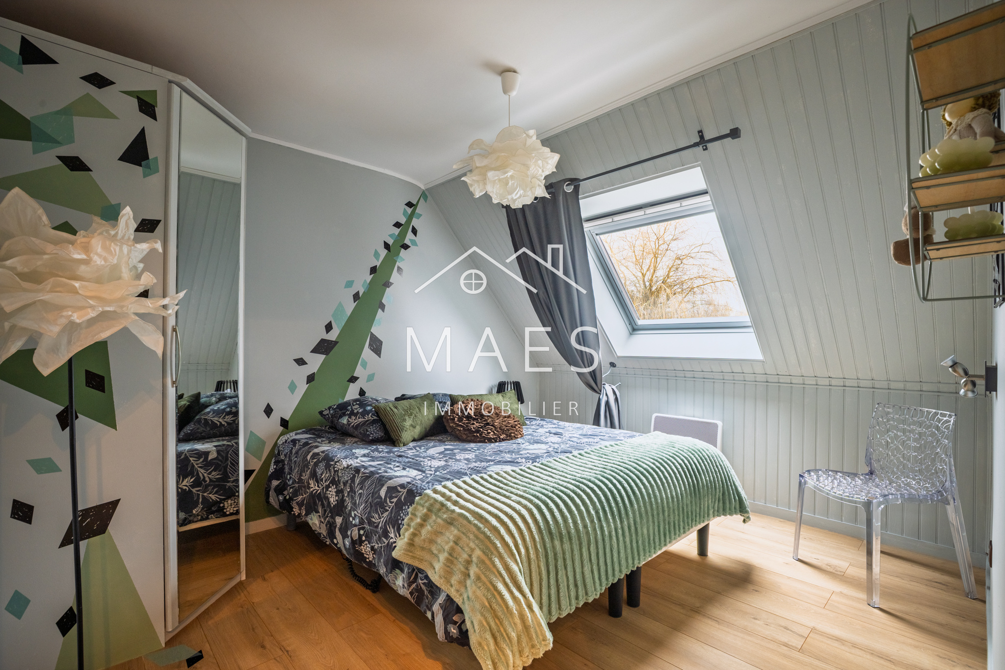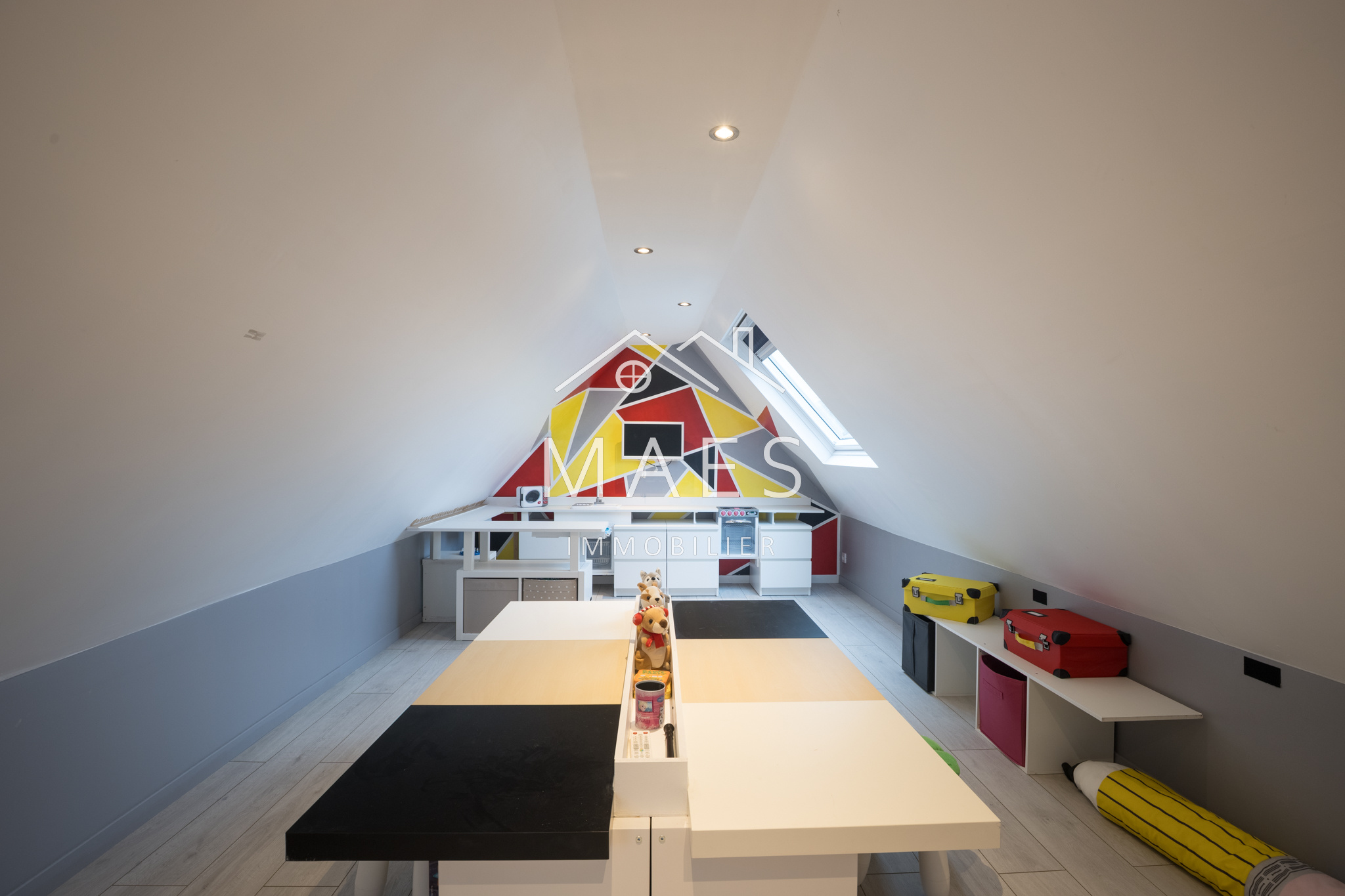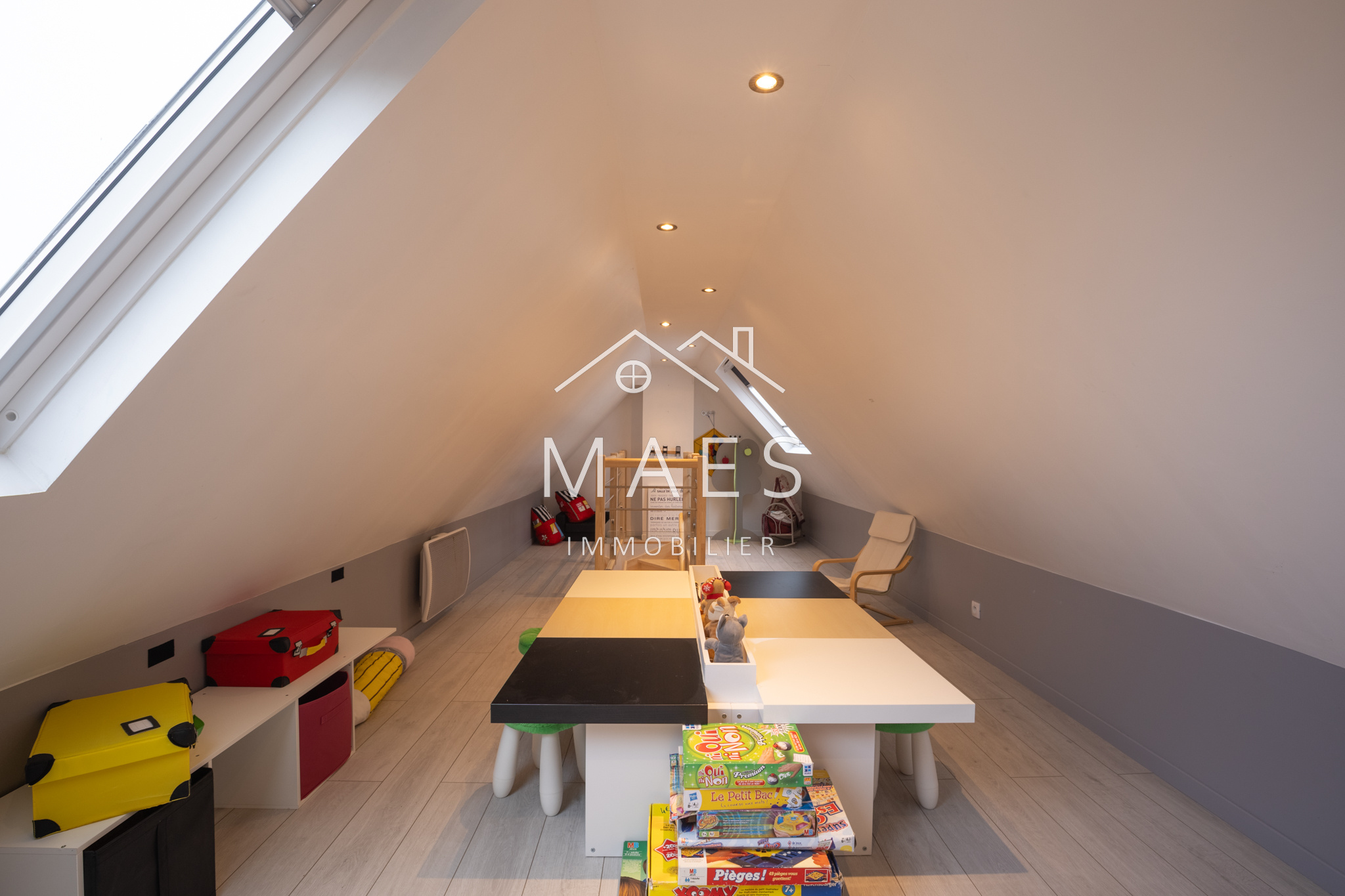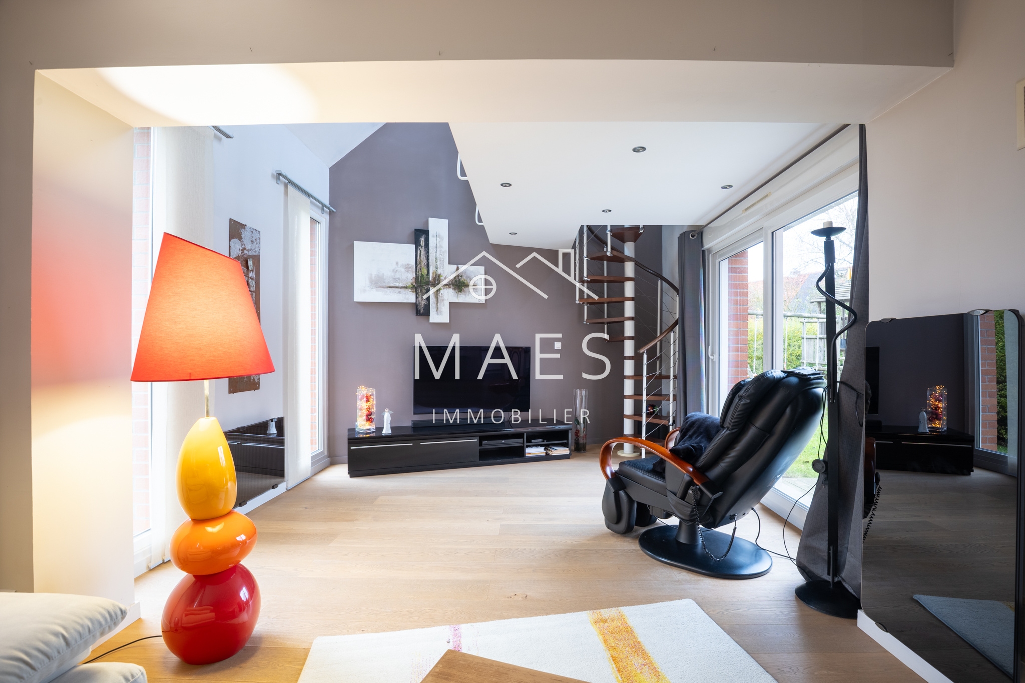 BONDUES - Idéalement située au calme dans un écrin de verdure, dans le domaine prisé du Vert Touquet, à proximité des commerces, écoles et transports, des champs pour vos promenades : COUP DE COEUR assuré pour cette charmante maison semi-individuelle de 1986 d'environ 118 m2 habitables (170 m2 au sol) bâtie sur un beau terrain arboré de 540 m2 ! Vous apprécierez ses volumes et prestations de qualité : l'entrée avec WC et vestiaire vous mène à un salon / séjour baigné de lumière, agrandi en 2010 par une belle extension formant un espace de vie convivial de plus de 60 m2 et intégrant un espace bureau en mezzanine.Une cuisine équipée, semi-ouverte par une magnifique verrière et fonctionnelle grâce à ses nombreux rangements et à son plan déjeunatoire. Le tout donnant sur la grande terrasse et l'agréable jardin où vous passerez de bons moments en famille ou entre amis. A l’étage, un large palier dessert quatre chambres confortables, toutes équipées de placards, ainsi qu’une salle de bains avec grande vasque et douche. Bel atout de la maison : les combles aménagés offrent une cinquième chambre lumineuse, idéale pour une salle de jeux, une chambre d’amis ou un spacieux bureau selon vos besoins. A l'extérieur, un jardin soigné d'environ 350 m2 agrémenté d'une terrasse bois et d'un chalet de jardin. Garage de 16m2 et deux places de parking extérieures privatives. Venez vite découvrir cette maison rare à la vente, chaleureuse et parfaitement entretenue, dans un cadre de vie exceptionnel !