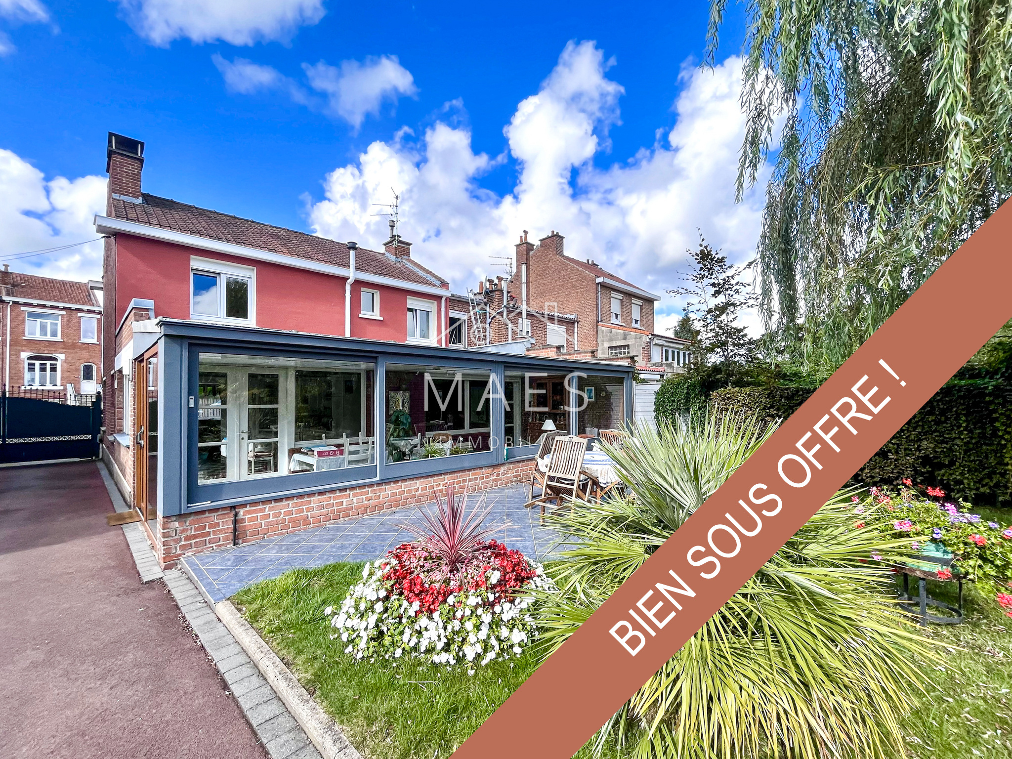 ** SOUS OFFRE ** À WAMBRECHIES, votre agence MAES IMMOBILIER vous propose une propriété idéalé pour activité (bâtisse, hangar, garages, parking, jardin) - sur un terrain de près de 900m2 situé proche de toutes commodités. Ce bel ensemble immobilier est composé : - D'une jolie maison semi-individuelle des années 60 d'environ 155 m2 habitables. Au rez-de-chaussée, vous profiterez d'une entrée lumineuse plus de 12m2 pouvant servir d'espace professionnel, d'un espace salon / salle à manger de 27m2 et d'une cuisine de 15m2 donnant sur une belle véranda bien exposée de plus de 26m2. La véranda offre un espace de vie des plus agréables avec une vue dégagée sur le jardin et sur la terrasse. On retrouve également une grande pièce de 17 m2, une buanderie et wc. Un bel escalier en chêne vous amène à l'étage où l'on retrouve 3 belles chambres lumineuse d'une surface comprise entre 11 et 13m2 ainsi qu'une salle de bain confortable. Possibilité de créer deux chambres supplémentaires dans les combles. - D'un beau jardin entretenu et arboré avec un potager. - D'un vaste hangar de 66m2 avec une hauteur d'environ 4m50. - D'un second hangar sur deux niveaux de 48m2 par étage. - D'un garage de près de 20m2. - D'un carport récent et sécurisé de 24m2. - D'un très grand parking en bout de propriété. Le tout est sécurisé par un portail électrique et desservi par une allée privée en bitume. Ce bien présente de nombreuses possibilités d'usage et saura ravir les aquéreurs en quête d'espace et de praticité pour leur activité. A découvrir sans tarder !