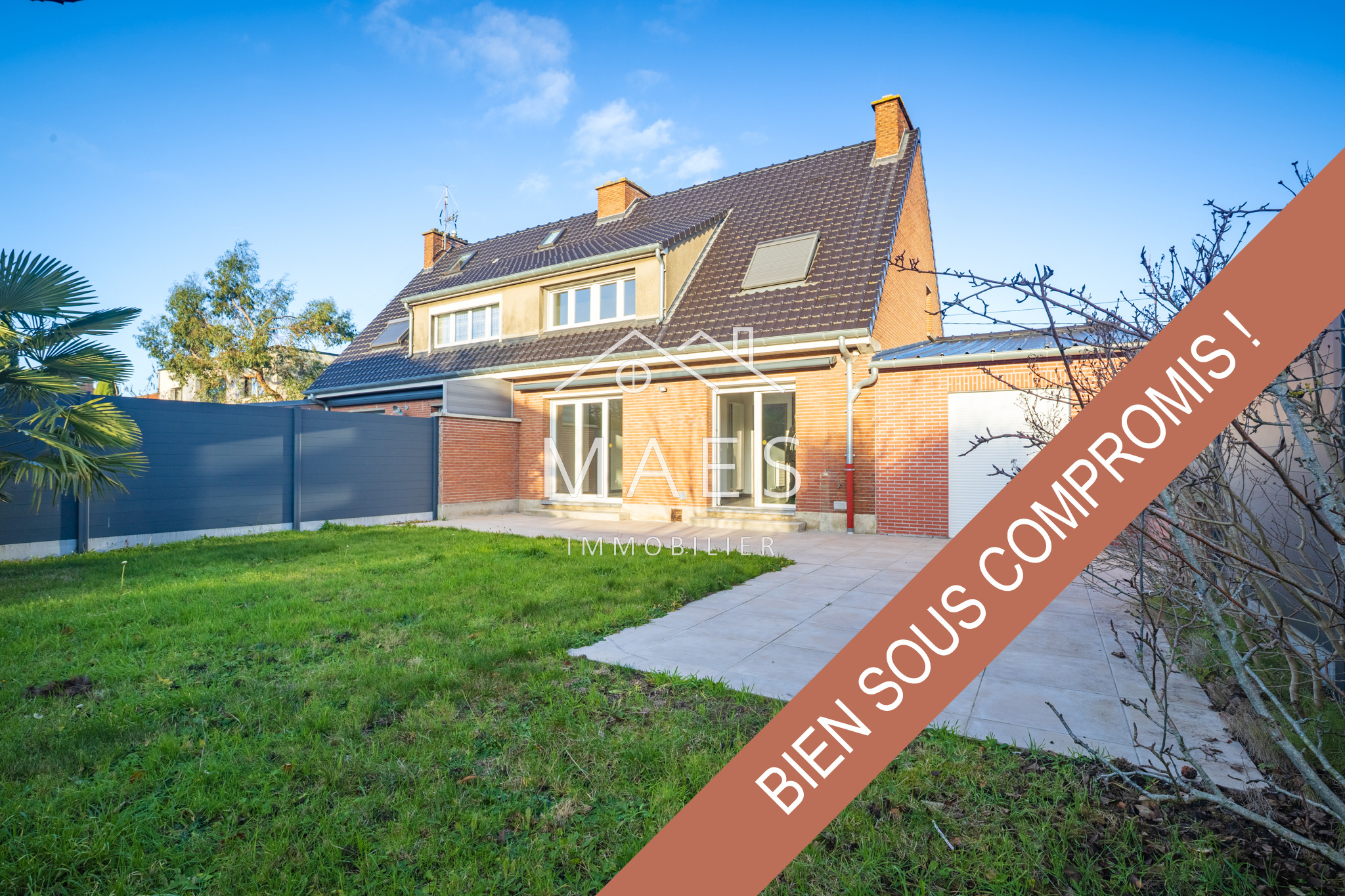 ** SOUS COMPROMIS **WAMBRECHIES Dans un quartier calme et proche du centre-ville, votre agence MAES IMMOBILIER vous propose de découvrir cette belle construction semi-individuelle d'environ 90 m2 / 130 m2 de surface au sol, avec 3 chambres, un beau jardin exposé sud-ouest, un grand garage, une cave et deux places de stationnement devant la maison. Un bien idéal pour une vie de famille.Dès l’entrée, vous êtes accueillis par une pièce de vie ouverte de 38 m2, baignée de lumière grâce à ses ouvertures sur le jardin. La cuisine récente, équipée et avec ses nombreux rangements, crée un bel ensemble convivial tourné vers l’extérieur. Cellier et vestiaire, WC indépendant.Le premier étage dessert trois chambres de 14,5, 9 et 9 m2, ainsi qu’une salle de bain confortable avec baignoire/douche, vasque et WC, pensée pour le quotidien. Placard de rangement.Les extérieurs vous séduiront de par un jardin parfaitement exposé, joliement arboré avec divers arbres fruitiers, et une agréable terrasse d'environ 30 m2.Un grand garage de 26 m2 et une cave de 14 m2 offrent de beaux espaces de stockage.Deux places de stationnement privées devant la maison.Travaux récemment réalisés : toiture, chaudière, menuiseries PVC double vitrage, électricité… Dans un bel environnement, cette maison bien entretenue est un vrai coup de cœur, venez vite la découvrir !