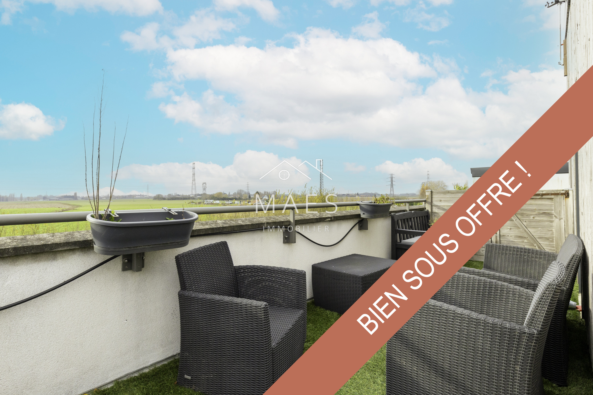 ** SOUS OFFRE ** WAMBRECHIES - A proximité immédiate des transports, commerces, axes routiers, des berges de la Deûle, très bien situé au calme dans une agréable résidence sécurisée de 2012, en bordure de campagne : votre agence MAES IMMOBILIER vous présente ce superbe appartement T4 (3 chambres) de 76,61 m2 Loi Carrez en dernier étage, avec une grande terrasse d'angle sud et sud-ouest donnant sur la campagne + un garage box fermé de 14 m2 et une place de parking privative ! Vous apprécierez ses volumes et prestations : l'entrée avec vestiaire, vous mène à une spacieuse et lumineuse pièce de vie de 31,79 m2, incluant une belle cuisine équipée, fonctionnelle grâce à ses nombreux rangements et son grand plan de travail doté d'un espace repas, avec électroménager de qualité. Vous apprécierez l'ouverture sur la large terrasse ensoleillée d'environ 24 m2 avec une vue dégagée sur les champs, permettant de passer de bons moments conviviaux ou de profiter de la tranquilité. Cellier, espace buanderie. Le couloir dessert trois chambres confortables, agrémentées de placards - penderies, ainsi qu'un WC indépendant et qu'une salle de bain familiale (grande douche, baignoire et vasque). Venez vite découvrir cet appartement chaleureux et soigné, un vrai coup de coeur !