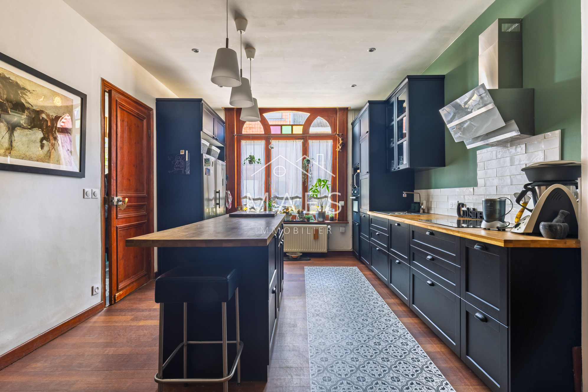 WAMBRECHIES - Au calme, à proximité immédiate du centre-ville, des transports, commerces et chemins de campagne pour vos promenades ; votre agence MAES IMMOBILIER a le plaisir de vous présenter cette charmante bâtisse des années 30 d'environ 158 m2, à la large façade, bâtie sur une parcelle ensoleillée de plus de 300 m2. Vous apprécierez ses beaux volumes et son cachet : l'entrée avec WC indépendant, vous mène à une spacieuse cuisine équipée récente, fonctionnelle grâce à ses nombreux rangements et son îlot central. Salle à manger très conviviale. Parquet massif, placards d'époque, hauteur sous plafond. Le salon donne sur l'agréable jardin. Espace bureau pratique en rez-de-chaussée, ou idéal pour du stockage. A l'étage, le palier dessert deux grandes chambres d'environ 13 m2 et 14,5 m2, dotées de placards intégrés / dressing. Une grande salle de bain familiale récente d'environ 18 m2, composée d'une vasque + baignoire, puis une salle de douche avec emplacement buanderie, deuxième WC. Au second, deux spacieuses chambres d'environ 15,5 m2 et 16 m2, placards / dressing pour chacune. Une mezzanine avec rangement complète la quatrième chambre. Parquet d'époque. Vous profiterez de bons moments sur la terrasse ensoleillée, et dans le beau jardin arboré exposé sud-est. Bassin et potager, cabanon de stockage + abri vélos. La maison dispose d'une cave voûtée. Venez vite découvrir cette bâtisse chaleureuse et bien entretenue !